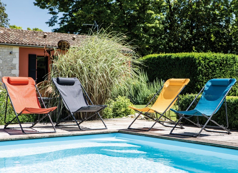 Châssis acier cataphorèse graphite , toile TPEP coloris paprika, Pliante, réglable 4 positions, têtière, légère, facile d’entretien. Dim L/H/P : 122x82x60 cm. Poids: 4,6 kg…