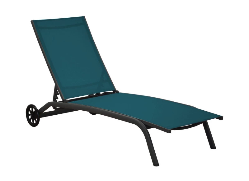 Châssis aluminium époxy coloris grey, toile TPEP coloris bleu, Empilable, Dossier réglable + position à plat, roues, Dim L/H/l : 192×30/92×71 cm Hauteur d’assise: 28 cm Poids: 7.8 kg …