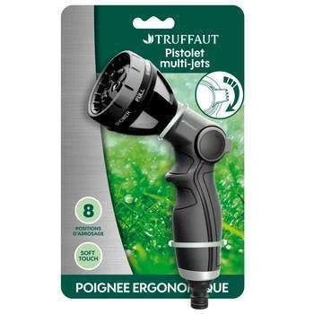 Ce pistolet d’arrosage permet de choisir entre 8 modes à sélectionner par simple rotation du cadran. Le débit se règle grâce à la molette arrière. Bimatière, il est agréable au toucher et solide….