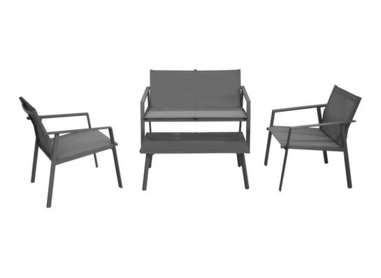 1 CANAPÉ 2 places ( Dim 143*79*66 cm ) + 2 FAUTEUILS simples (Dim 59 * 79 * 66 cm ) + 1 TABLE BASSE rectangulaire avec plateau en verre ( Dim 90 * 50 * 35 cm ). Structure en aluminium et toile en…