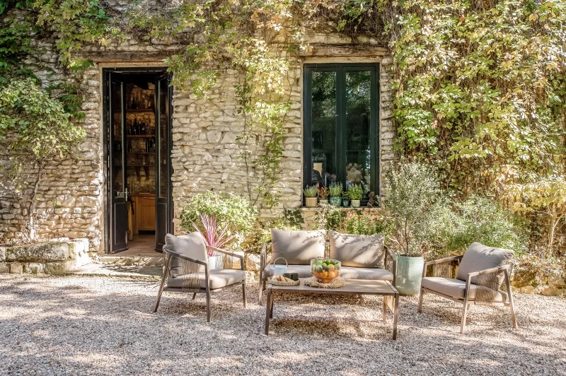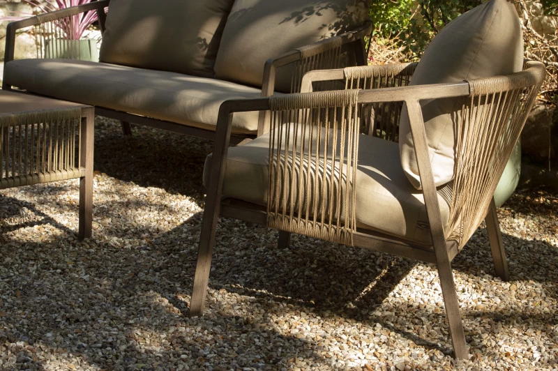 Structure en aluminium, peinture effet chêne et résine tressée. Coussins en acrylique teinté dans la masse 260 g. Garnissage : mousse 25 kg/m3.